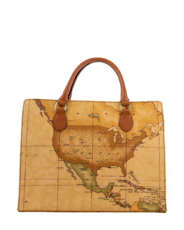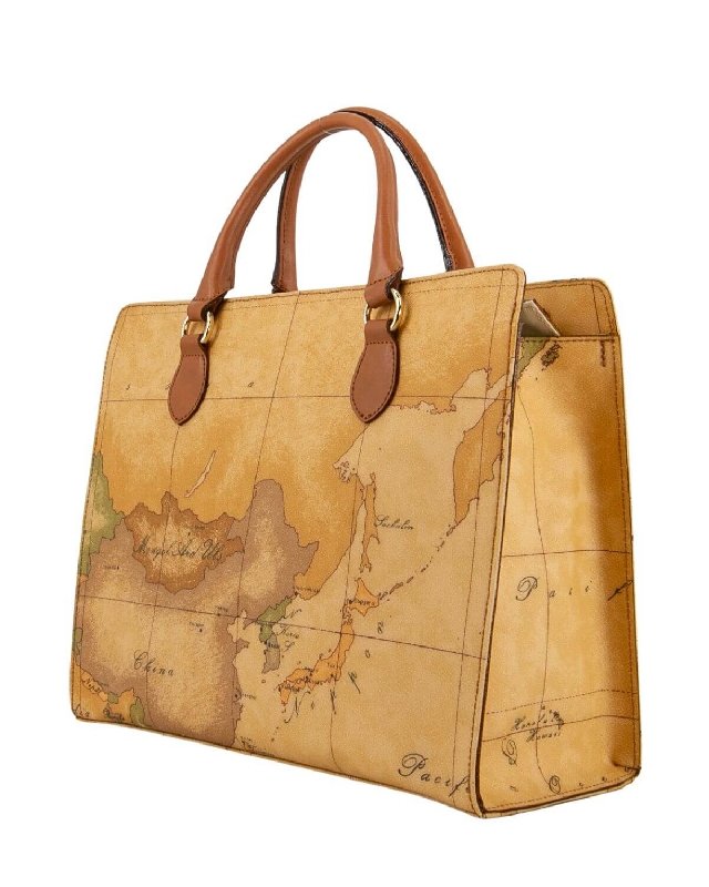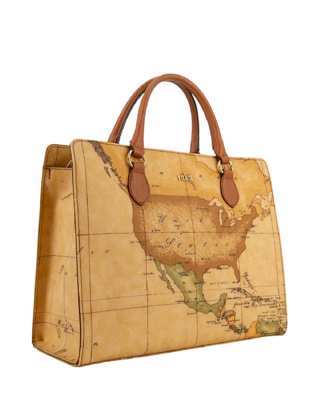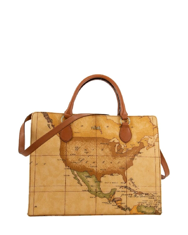 Umhängetasche aus bedrucktem Stoff mit Geo Classic Karte. Metallarbeit mit 1AClasse-Logo und Goldverzierung, lederfarbener Rindslederbesatz und Details. Passende Nähte und Rippenbündchen. Doppelt tragbar, über die Schulter und quer über den Körper. Taschenkopf mit lederfarbenem Rindsledereinsatz. Anhänger aus lederfarbenem Rindsleder mit goldener Plakette, personalisiert mit dem 1AClasse-Logo.
