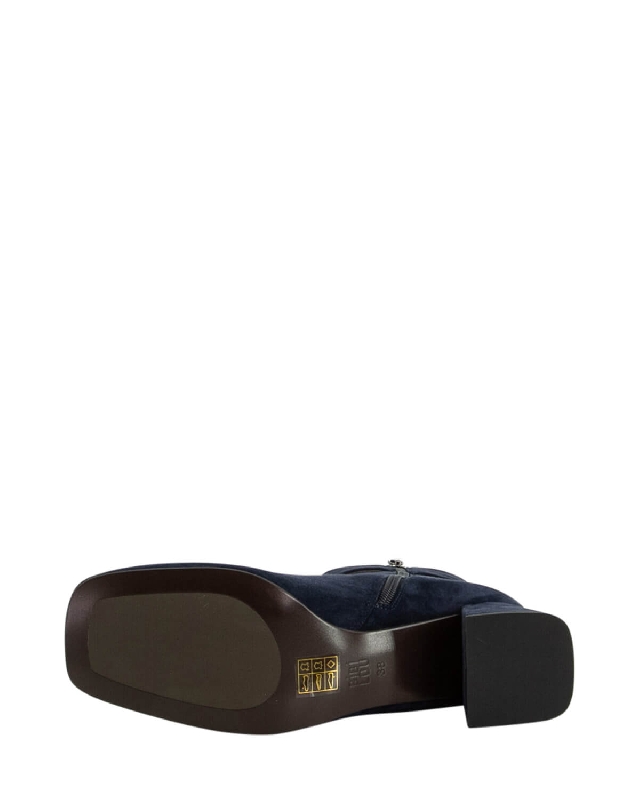 Stiefelette aus Wildleder. Seitlicher Reißverschluss. Schnalle am Bein. Quadratische Spitze. Mittelhoher Absatz.
