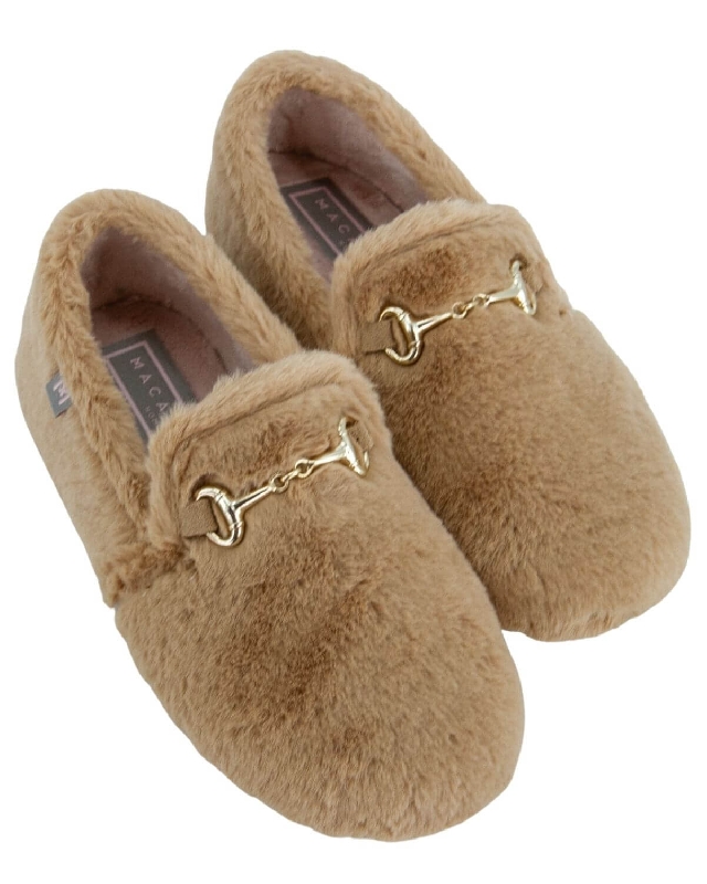 Hausschuhe aus weichem Teddyfell. Verziert mit einer goldenen Metallschnalle.Sohlenhöhe 1 cm. Herausnehmbare Innensohle aus Polyurethan. Die Farbe des Artikels kann, je nach Gerät, das für die Navigation verwendet wird, leicht variieren.