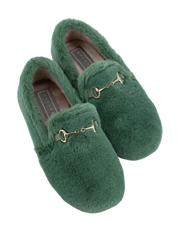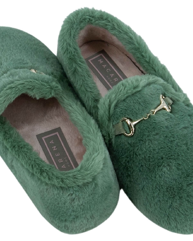 Hausschuhe aus weichem Teddyfell. Verziert mit einer goldenen Metallschnalle. Sohlenhöhe 1 cm. Herausnehmbare Innensohle aus Polyurethan. Die Farbe des Artikels kann, je nach Gerät, das für die Navigation verwendet wird, leicht variieren.