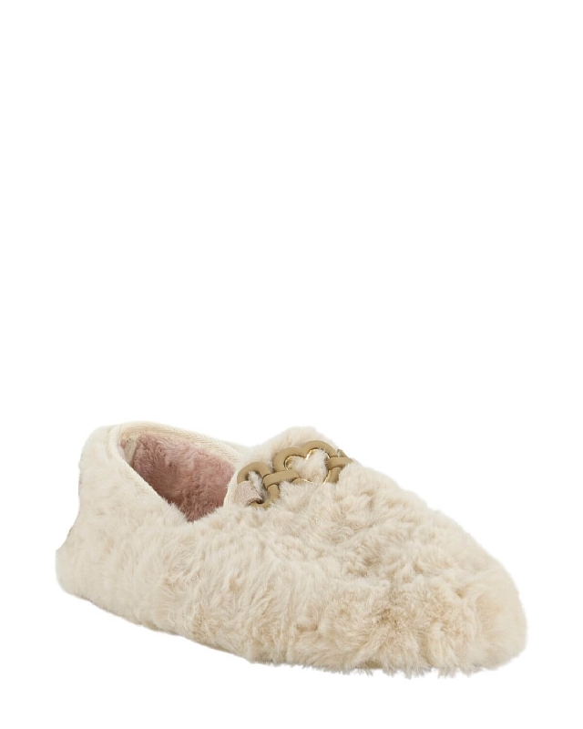 Hausschuhe aus weichem Teddyfell. Verziert mit einer goldenen Metallschnalle. Sohlenhöhe 1 cm. Herausnehmbare Innensohle aus Polyurethan. Die Farbe des Artikels kann, je nach Gerät, das für die Navigation verwendet wird, leicht variieren.