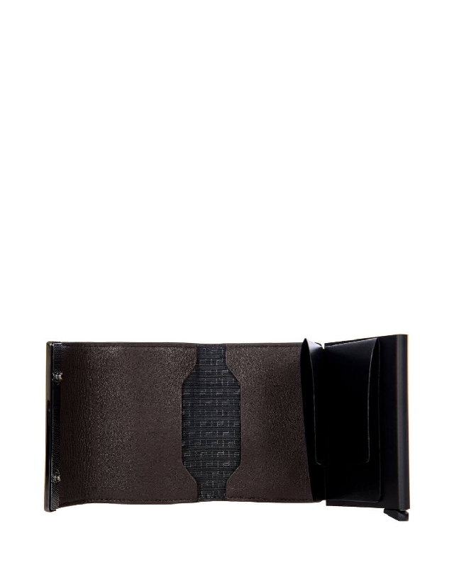 Exklusiver Porsche Design X Secrid Kartenhalter. Kartenhalter aus Metall mit Pop-up-Funktion und Lederhülle mit Banknotenfach und Platz für sechs Kreditkarten.