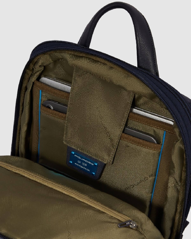 Erweiterbarer flacher Rucksack _ PC15,6'' und iPad® Halter aus recyceltem Stoff und Leder mit Tasche für AirPods®, Stoß- und RFID-Schutz, erweiterbar