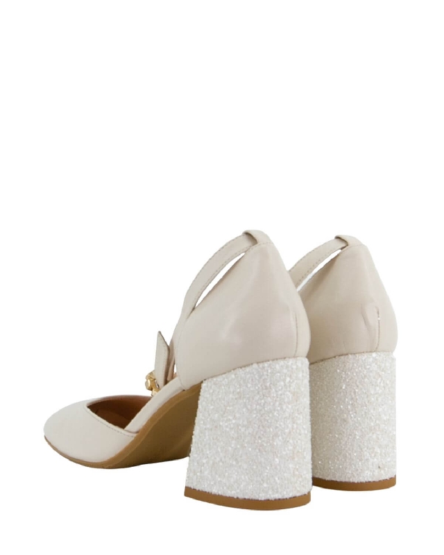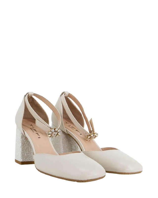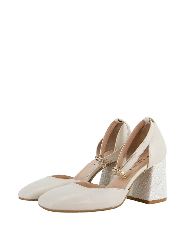 Lederschuh mit überzogenem Absatz. Riemen und Schnallenverschluss am Knöchel. Quadratische Zehe.