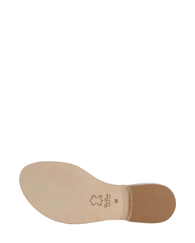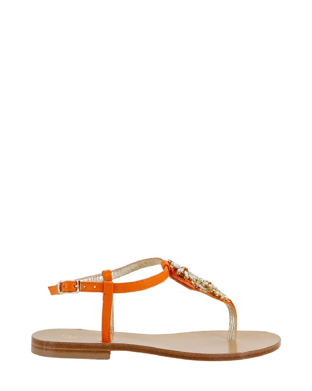 Sandalen aus Leder mit Mikrokristall- und Juwelenapplikationen. Riemen und Schnallenverschluss. Sohle aus Leder.
