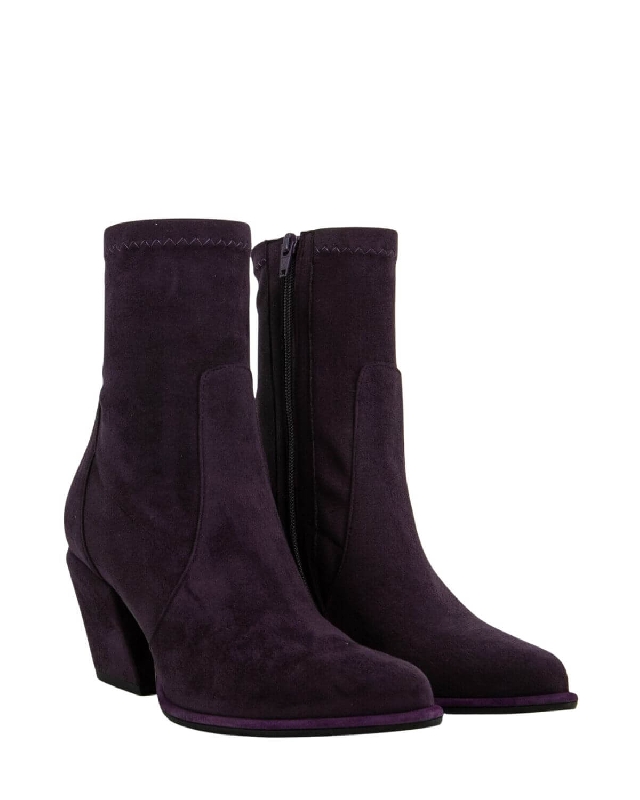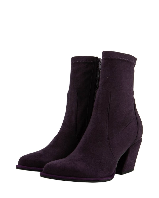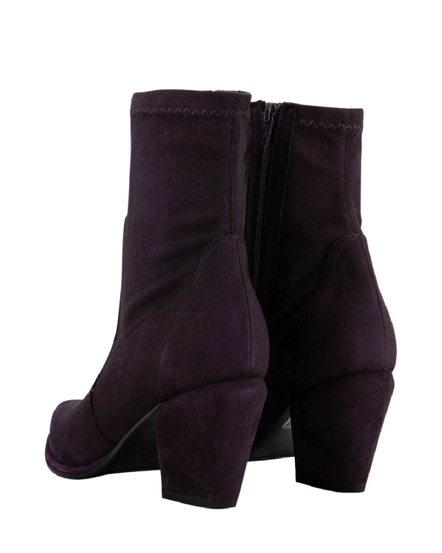 Seitlicher Reißverschluss; spitze Schuhe; Wildlederschuhe; breiter Absatz.