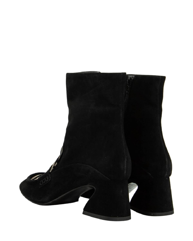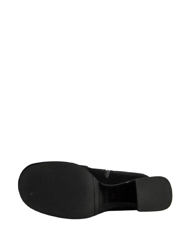 Seitenreißverschluss; quadratische Spitze; Wildlederschuhe; breiter Absatz.