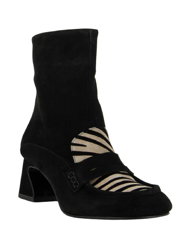 Seitenreißverschluss; quadratische Spitze; Wildlederschuhe; breiter Absatz.