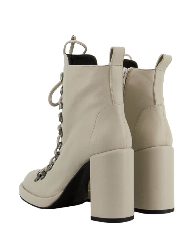 Schnürverschluss; seitlicher Reißverschluss; runde Spitze; Lederschuhe; breiter Absatz.