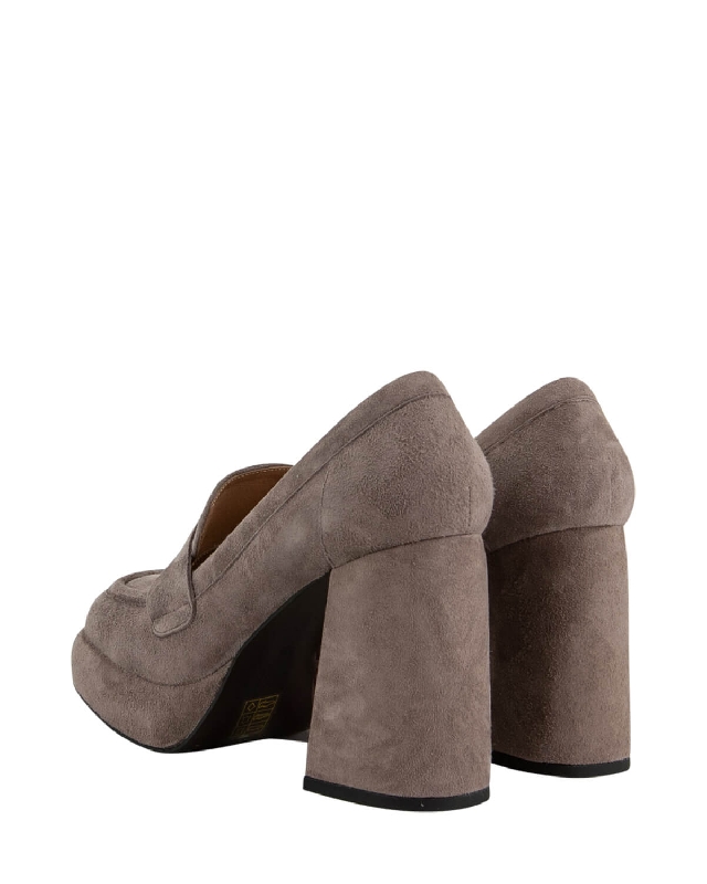 Mokassins aus Wildleder. Hoher, breiter Absatz. Quadratische Spitze.