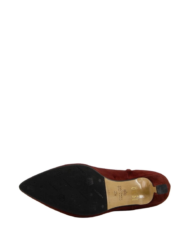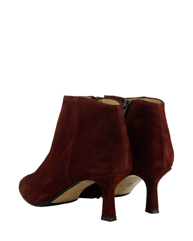 Stiefelette aus Wildleder. Seitlicher Reißverschluss. Feiner Absatz. Spitz zulaufender Schuh.