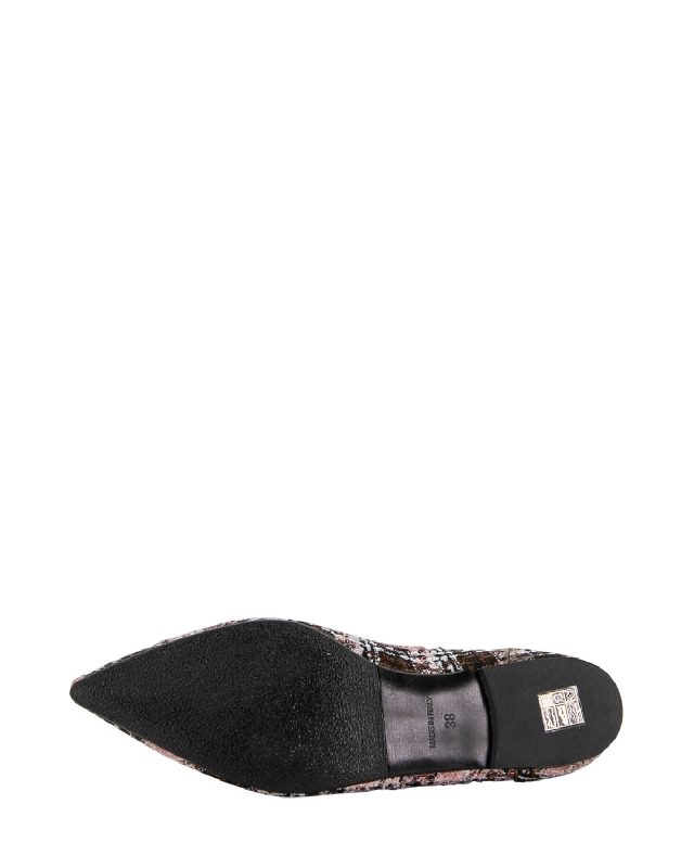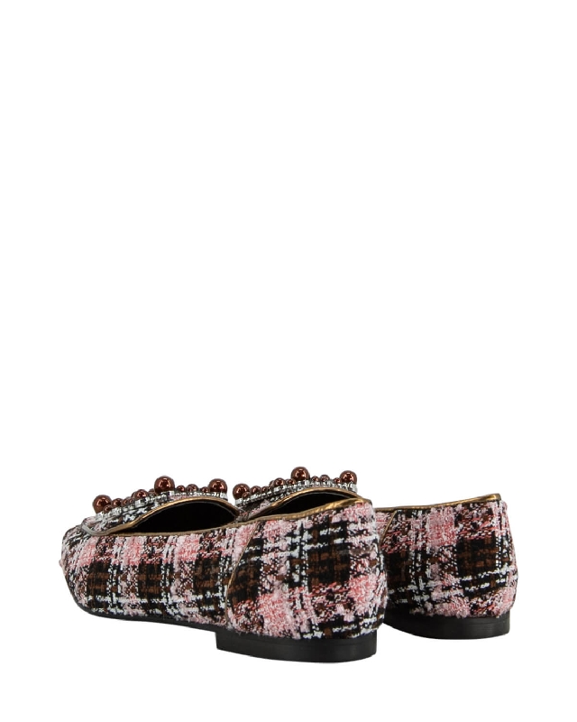 Mokassins aus Bouclè-Stoff. Perlen-Accessoire. Spitz zulaufender Schuh. Niedriger Absatz.