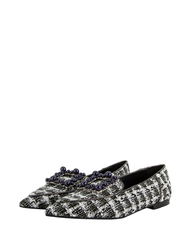 Mokassins aus Bouclè-Stoff. Perlen-Accessoire. Spitz zulaufender Schuh. Niedriger Absatz.