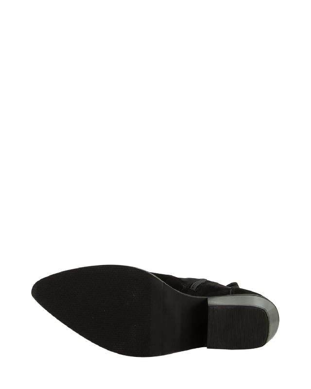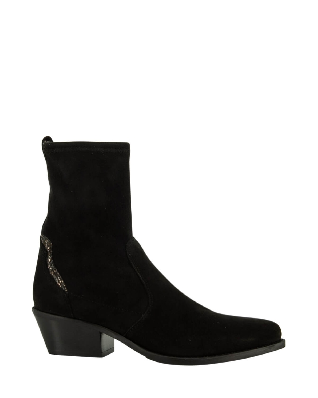Schwarze Nubuk-Stiefelette mit Absatz, Innenreißverschluss, Lederfutter und bronzefarbenem Zierelement auf der Rückseite. Lederschuhe. Mittelhoher Absatz. Spitze Schuhe. Gummisohle. Seitlicher Zipverschluss. Die Farbe des Artikels kann, je nach Gerät, das für die Navigation verwendet wird, leicht variieren.