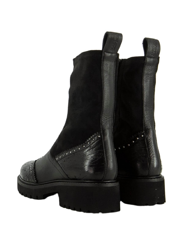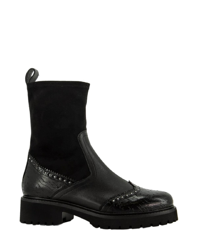 Stiefelette mit Nietenbesatz, perfekt, um Ihrer Garderobe einen Hauch von Kühnheit zu verleihen. Dank ihrer Vielseitigkeit lassen sie sich leicht mit verschiedenen Outfits kombinieren, von lässig bis elegant. Lederschuhe. Niedriger Absatz. Runde Form. Gummisohle. Seitlicher Zipverschluss. Die Farbe des Artikels kann, je nach Gerät, das für die Navigation verwendet wird, leicht variieren.