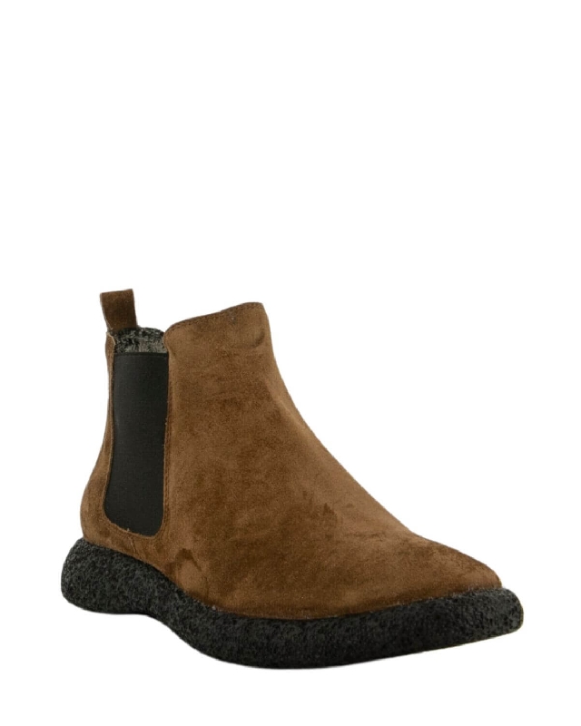 Wildlederstiefelette mit kontrastierender schwarzer Sohle, Lederfutter und elastischem Stoff am Schaft. Wildlederschuhe. Niedriger Absatz. Gummisohle. Ohne Schnuersenkel. Die Farbe des Artikels kann, je nach Gerät, das für die Navigation verwendet wird, leicht variieren.