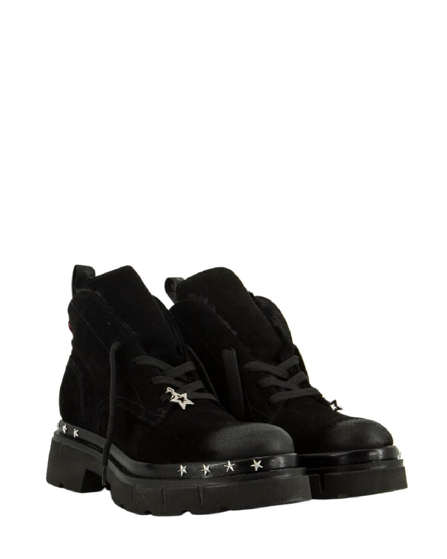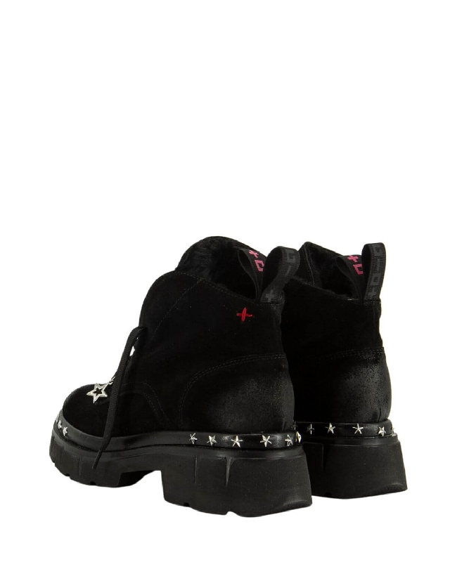 GIO+ Stiefel aus schwarzem Wildleder. Gekennzeichnet durch sternförmige Ösen, schwarze Schnürung.