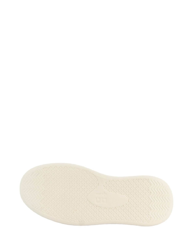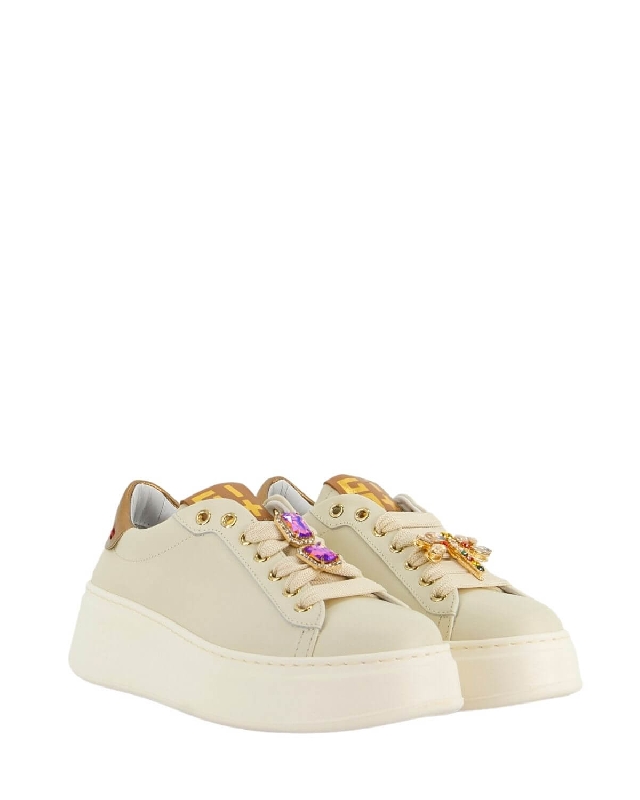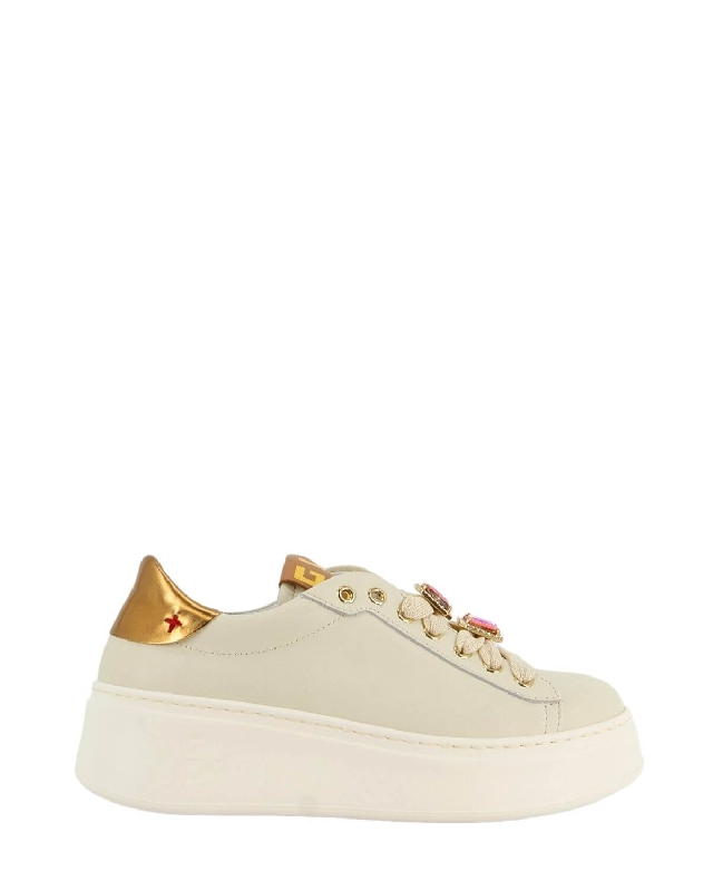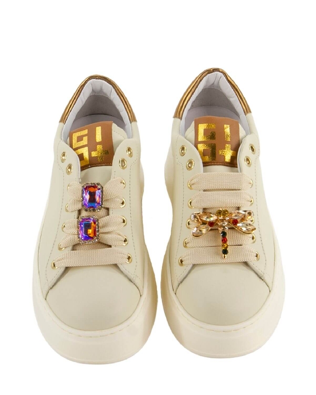 GIO+ Sneaker aus milchfarbenem Leder mit bronzefarbenem Laminatabsatz. Er verfügt über goldene Metallösen, ein Etikett auf der Zunge mit dem Logo in Goldlaminat und applizierten Libellen- und Schmuckaccessoires sowie flache Baumwollschnürsenkel.