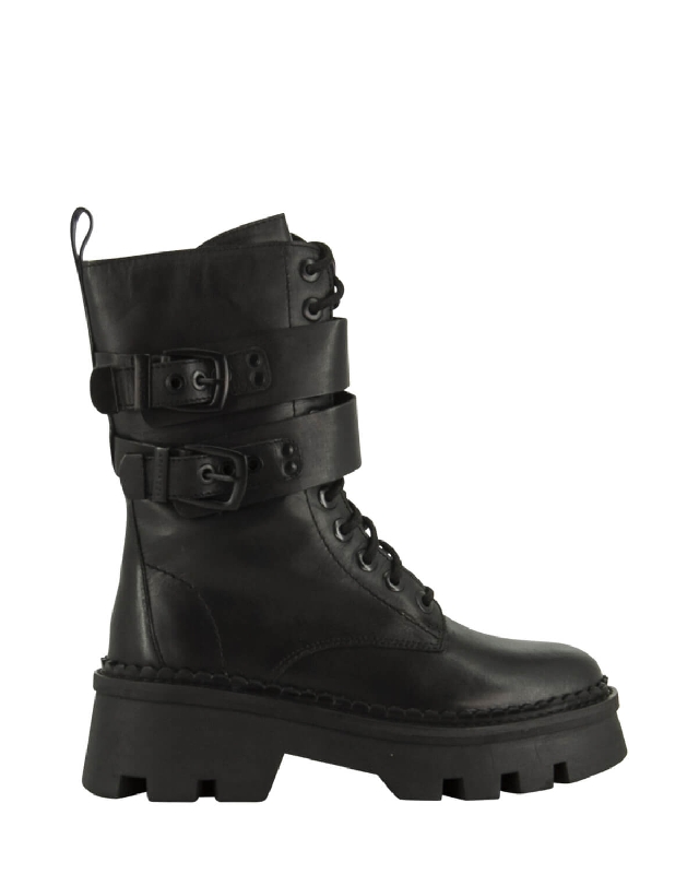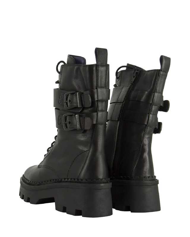 Nora ist ein Leder-Kampfstiefel mit einem verstellbaren Doppelriemen am Schaft. Er hat einen seitlichen Reißverschluss, einen übergroßen, rahmengenähten Boden, einen 50 mm hohen Absatz und einen 30 mm hohen Vorderfuß. Seine Form ist abgerundet und sein Volumen ist groß und modern. Eine weiche Latexpolsterung umgibt die Lederinnensohle. Die Farbe des Artikels kann, je nach Gerät, das für die Navigation verwendet wird, leicht variieren.