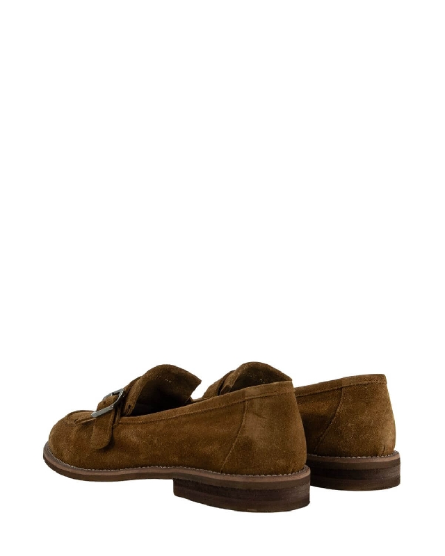 Suede moccasins with fringes and buckle. Round toe. Rubber sole.