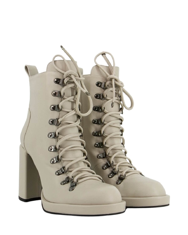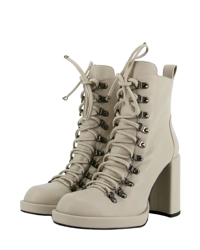 Lace-up closure; side zip; round toe; Leather shoes; Wide heel.