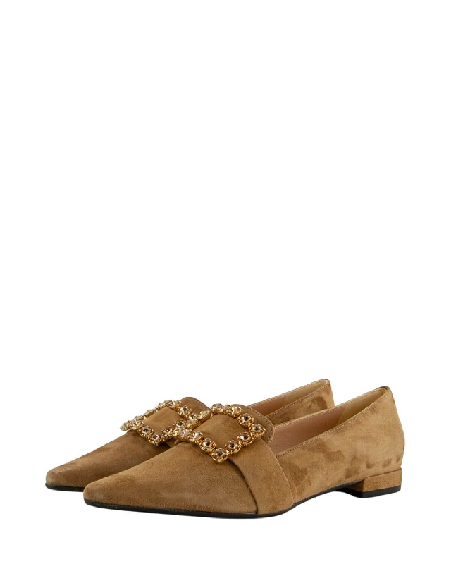 Suede moccasins with glitter accessory. Pointed shoe. Low heel.