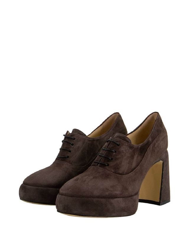 Suede shoes. High, wide heel. Round shape. Lace-up fastening.