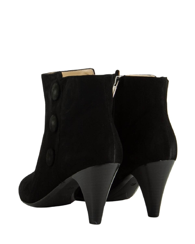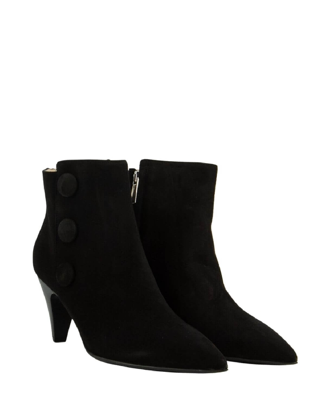 Suede ankle boots with button accessories. Pointed toe shoes. With zip.