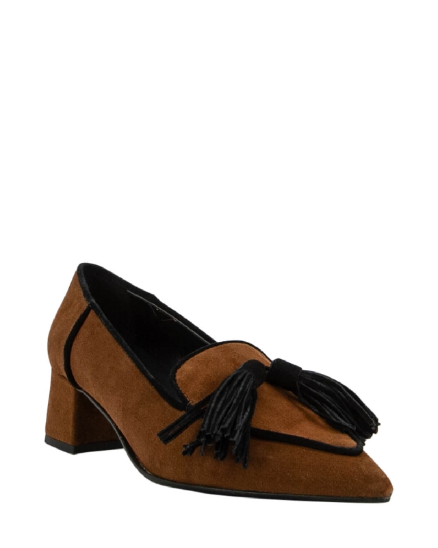 Suede moccasins. Nappa leather accessories. Pointed toe shoes. Medium heel.