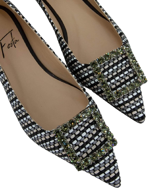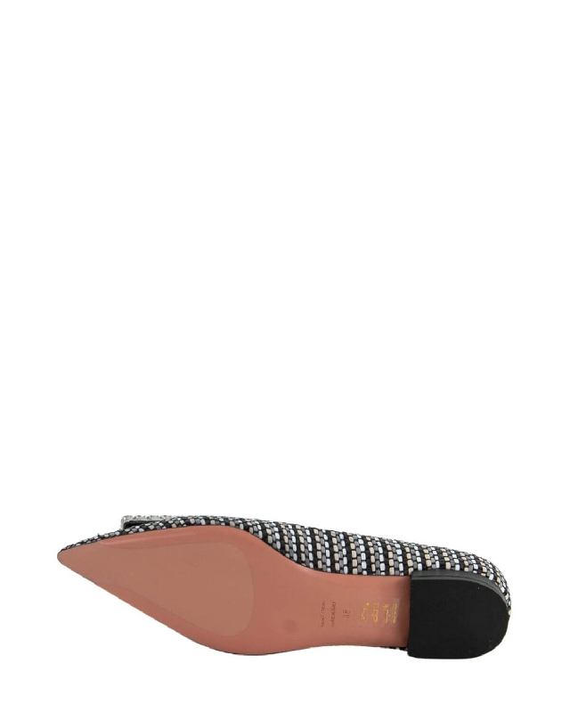 The Amaia flat ballerina is made from woven raffia and embellished with a rhinestone buckle that matches the upper and a structured 1 cm low heel. A classic must-have for the modern woman.