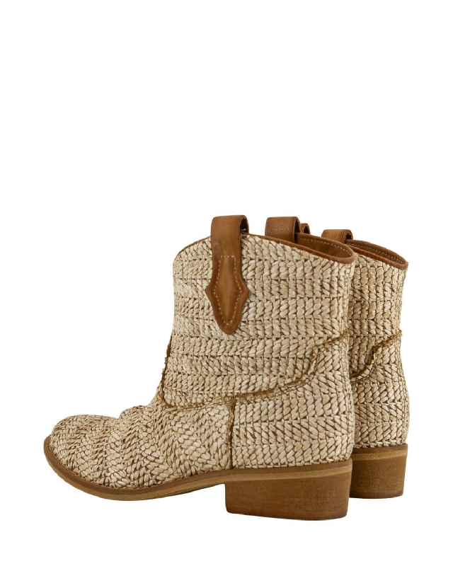 Western-style boots made from leather and raffia. Round toe. Medium-high heel.