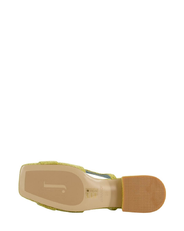 Textile shoes. Juwel accessory. Low heel. Square toed tip. Clasp with strap.