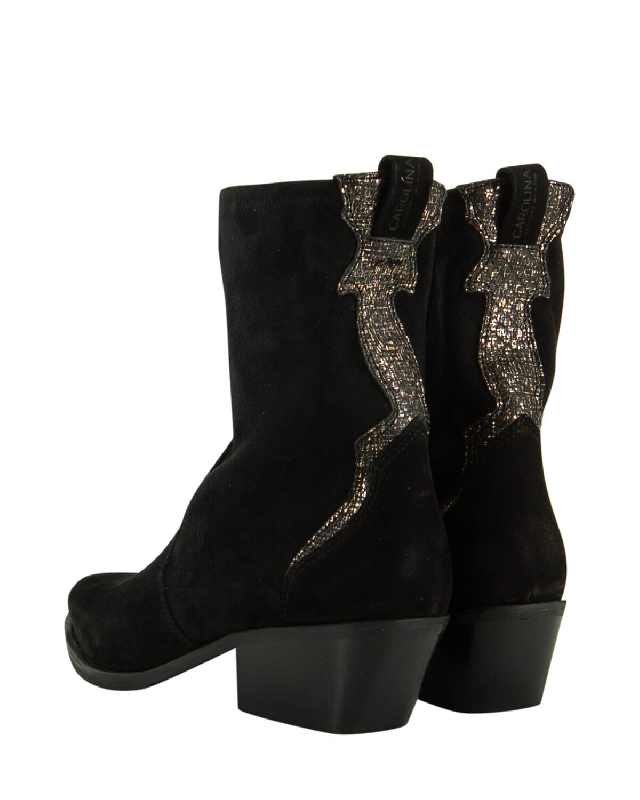 Black nubuck ankle boot with heel, inner zip, leather lining and bronze-coloured decorative element on the back. Leather shoes. Mid heel. Pointed shoes. Rubber sole. Clasp with lateral zip. The colour of the article may vary slightly depending on the device used for navigation.