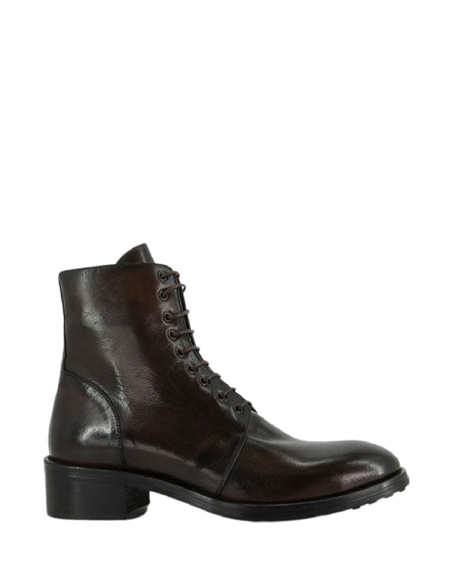 These brown leather ankle boots offer timeless elegance. The classic design goes perfectly with any outfit and makes them ideal for any occasion, from casual to formal. Their construction guarantees comfort and support, making them a perfect choice for everyday wear. Leather shoes. Low heel. Blunted tip. Rubber sole. Clasp with laces. The colour of the article may vary slightly depending on the device used for navigation.