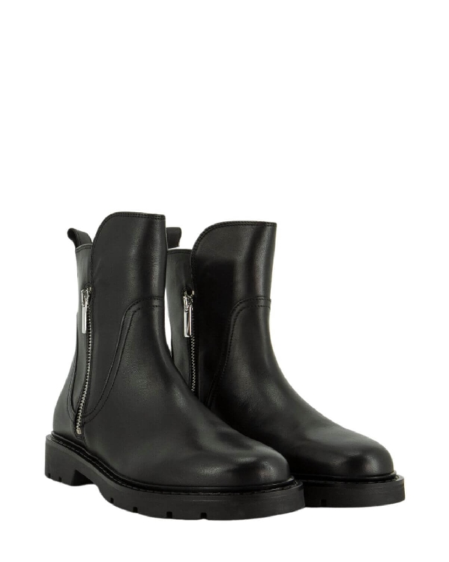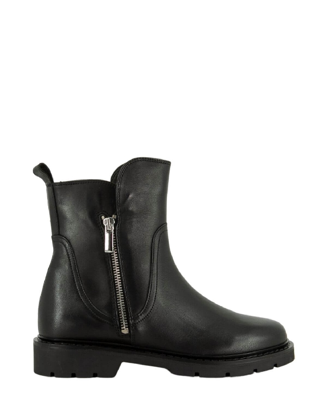 An ankle boot characterised by a double side zip and an asymmetric upper, the BRIT ZIP is the perfect all-day companion. It is made of black leather and is also available in a delavé leather variant. Leather shoes. Low heel. Rounded tip Rubber sole. Clasp with lateral zip. The colour of the article may vary slightly depending on the device used for navigation.