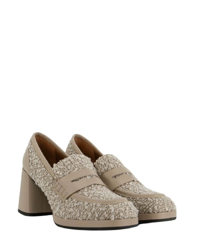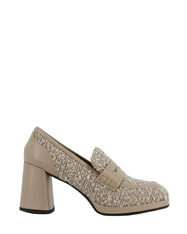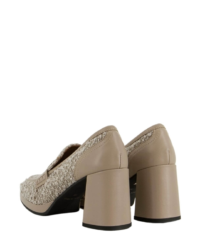 This loafer is made of a fabric that gives it an elegant and sophisticated look. Its versatility makes it suitable for various occasions, from work to leisure, guaranteeing style at all times. Leather shoes. Mid heel. Square toed tip. Rubber sole. Without laces. The colour of the article may vary slightly depending on the device used for navigation.