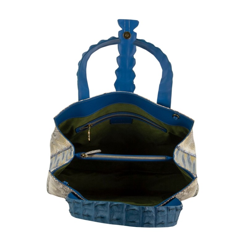 Shopping bag made of genuine python leather with wild crocodile leather embellishments. Magnetic button closure. Shoulder strap included. Double handles in wild crocodile leather. Alcantara lining, inside pockets, inside compartments. Metal feet. The color of the item may vary slightly depending on the device used for browsing.