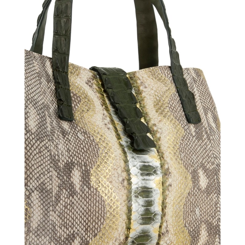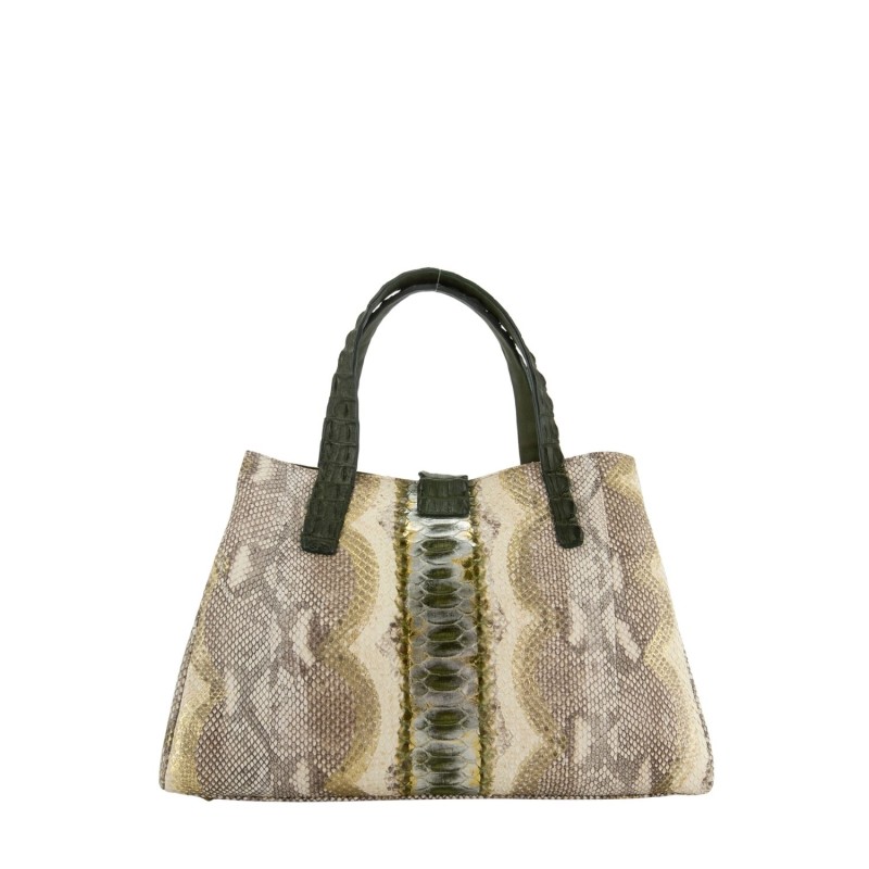 Shopping bag made of genuine python leather with wild crocodile leather embellishments. Magnetic button closure. Shoulder strap included. Double handles in wild crocodile leather. Alcantara lining, inside pockets, inside compartments. Metal feet. The color of the item may vary slightly depending on the device used for browsing.