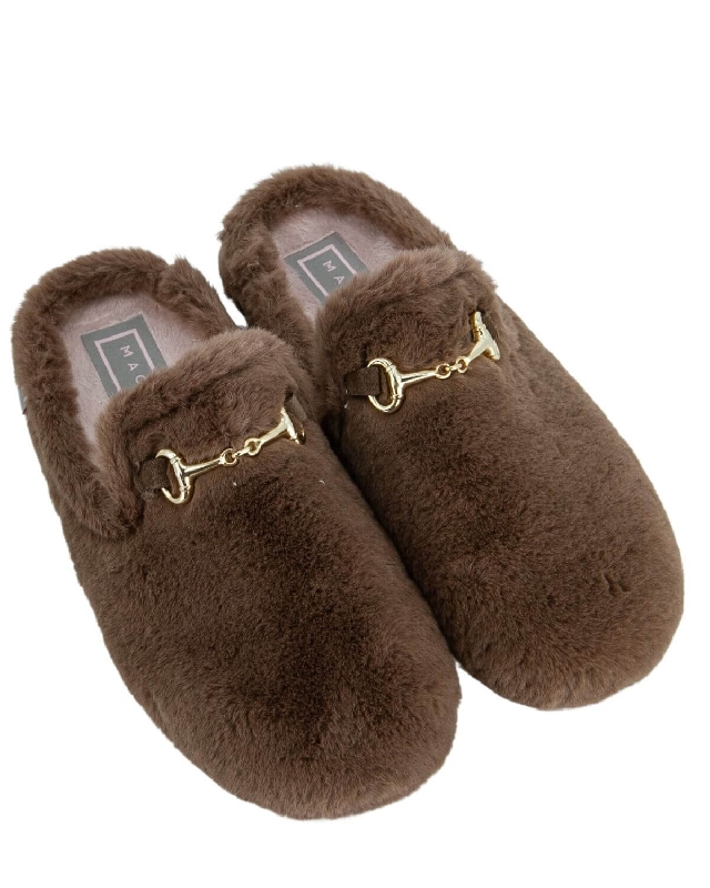 Slippers made of soft teddy fur. Decorated with a golden metal buckle. Sole height 1 cm. Removable insole in polyurethane. The colour of the article may vary slightly depending on the device used for navigation.
