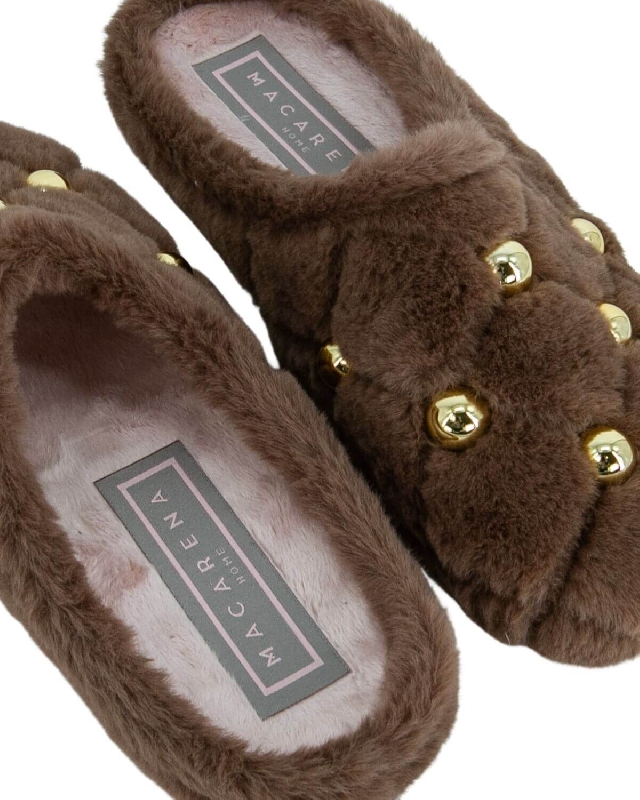 Slippers in soft teddy fur, embroidered and decorated with golden round studs. Sole height 1 cm. Removable insole in polyurethane. The colour of the article may vary slightly depending on the device used for navigation.