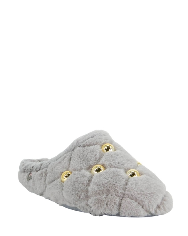 Slippers in soft teddy fur, embroidered and decorated with golden round studs. Sole height 1 cm. Removable insole in polyurethane. The colour of the article may vary slightly depending on the device used for navigation.