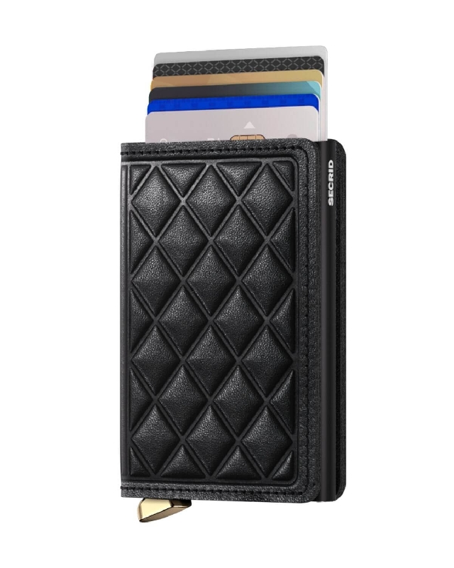 A highly prestigious wallet featuring a custom-designed diamond-shaped embossing and the highest quality sheepskin leather. The gold-colored flat closure button emphasizes the elegant profile of this wallet. A luxurious detail for everyday use.