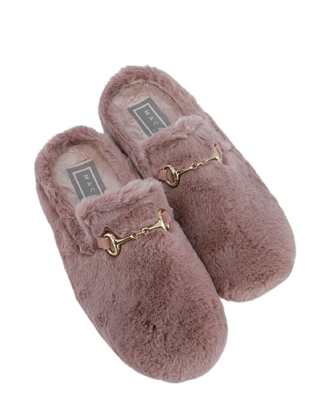 Slippers made of soft teddy fur. Decorated with a golden metal buckle. Sole height 1 cm. Removable insole in polyurethane. The colour of the article may vary slightly depending on the device used for navigation.