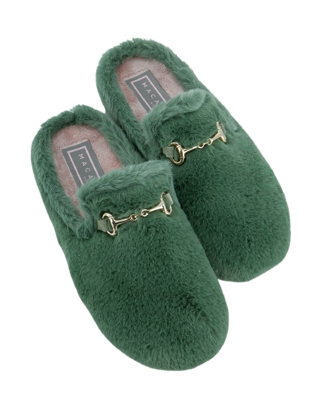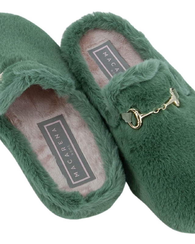 Slippers made of soft teddy fur. Decorated with a golden metal buckle. Sole height 1 cm. Removable insole in polyurethane. The colour of the article may vary slightly depending on the device used for navigation.