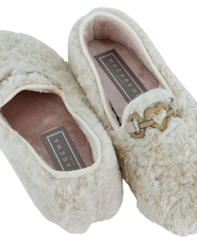 Slippers made of soft teddy fur. Decorated with a golden metal buckle. Sole height 1 cm. Removable insole in polyurethane. The colour of the article may vary slightly depending on the device used for navigation.