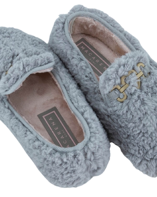 Slippers made of soft teddy fur. Decorated with a golden metal buckle. Sole height 1 cm. Removable insole in polyurethane. The colour of the article may vary slightly depending on the device used for navigation.