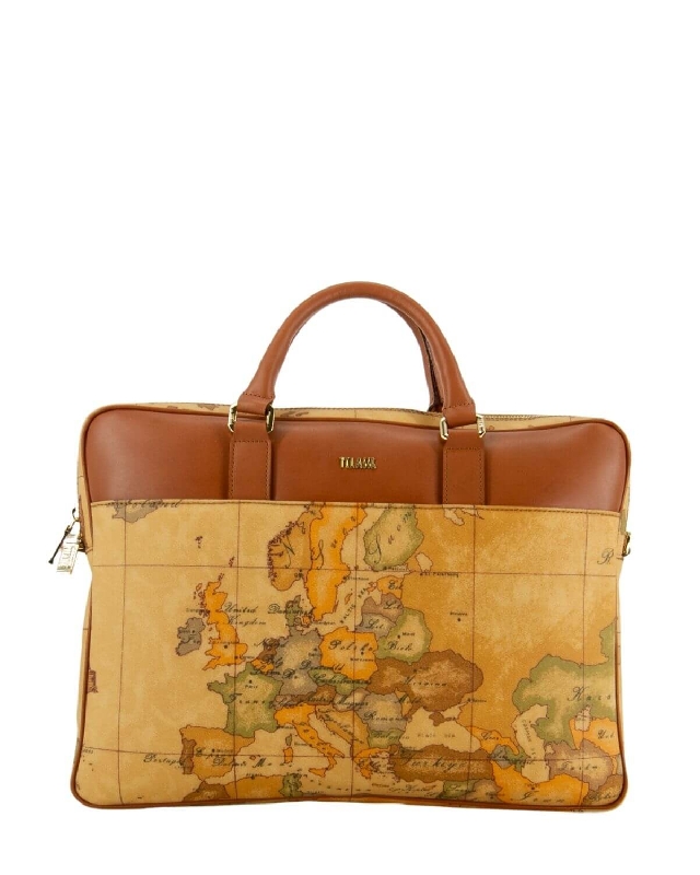 Laptop briefcase made of embossed fabric with Geo Classic print, enriched with leather details. It features a double-slider zip closure and an adjustable, removable logo ribbon shoulder strap. This model boasts a compact design, perfect for storing your computer and all your work-related materials. Stylish and multifunctional, thanks to the detachable shoulder strap, the bag can be carried by hand or worn over the shoulder. The colour of the article may vary slightly depending on the device used for navigation.