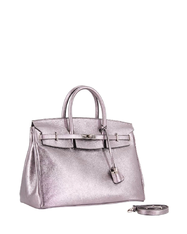 Materiale: pelle di vitello metalizzata- modello: borsa a due maniglie - fodera in pelle - chiusura con pattina e girello in argento - tracolla con moschettoni e scorrevole accorciabile. Scomparto interno divisore con lampo - tasco interno con lampo - taschino interno in pelle portacellulare - taschino interno in pelle portadocumenti - piedini in metallo salvafondo. Il colore dell'articolo può variare leggermente a seconda del dispositivo utilizzato per la navigazione.