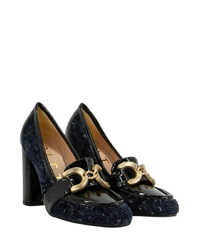 Mocassini in pelle laccati lucidi e tessuto. Accessorio a catena. Punta tonda. Tacco alto e largo.