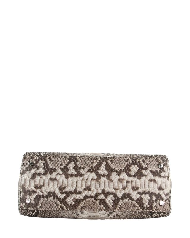 Borsa shopping in vera pelle di pitone con rifiniture in vera pelle di coccodrillo selvaggio. Bottone magnetico di chiusura. Tracolla inclusa. Doppi manici in pelle di coccodrillo selvaggio. Fodera interna in alcantara, tasche interne, scomparti interni. Piedini in metallo.